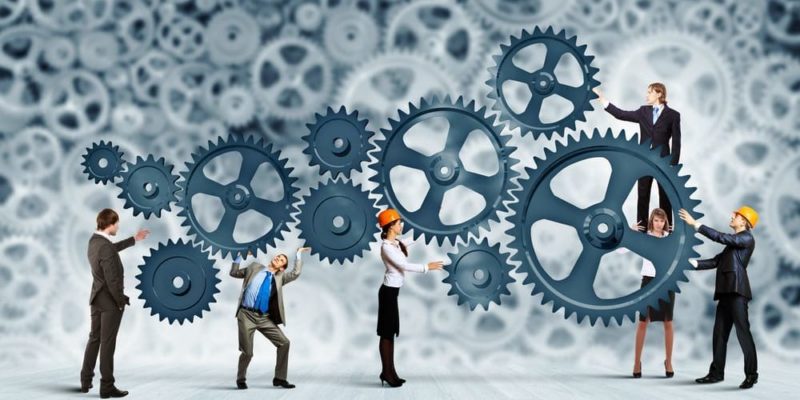 - Descripción de la imagen miniatura: esta imagen representa varios engranajes de color gris, de diferentes tamaños, que están encajados entre sí, formando un mecanismo funcional. Alrededor de estos engranajes, hay pequeñas figuras humanas (tanto hombres como mujeres), vestidas con atuendos de negocios o casuales (trajes, camisas, faldas y pantalones), algunas con cascos de seguridad naranjas o amarillos.